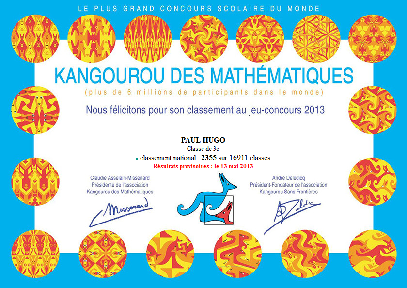 Hugo a été classé 2355ème sur 16911 élèves de classe de 3ème ayant participé au concours