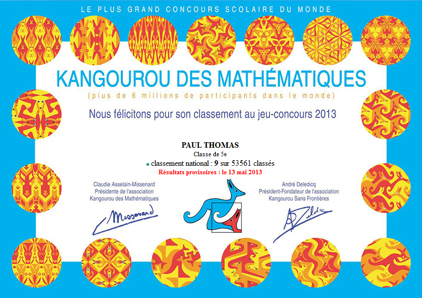 Thomas a été classé 9ème sur 53561 élèves de classe de 5ème ayant participé au concours
